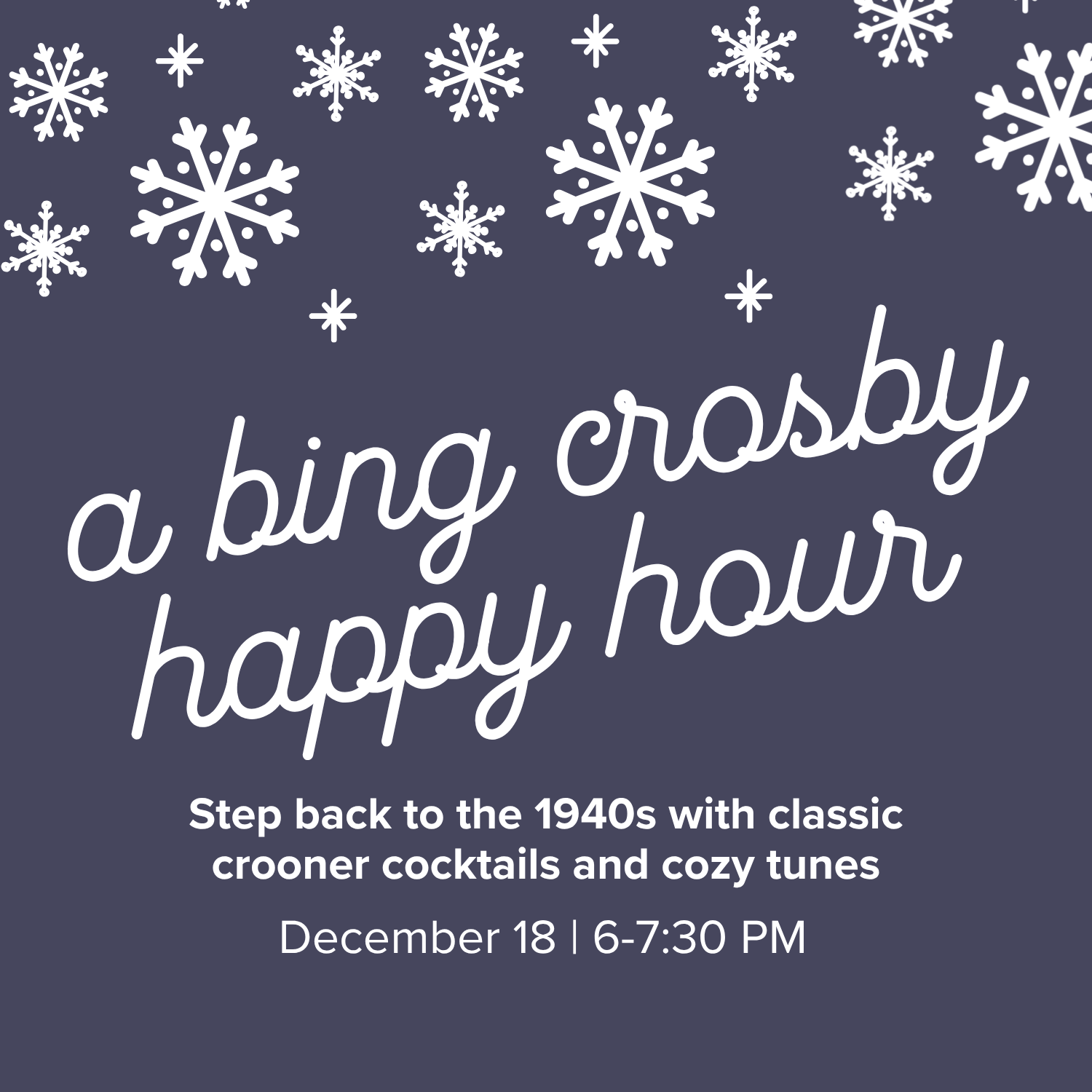 Take a step back to the 1940s with Bing Crosby Happy Hour. We’ll be mixing classic cocktails from the era, sipping along to cozy crooner tunes, and soaking up a little old-school holiday charm.