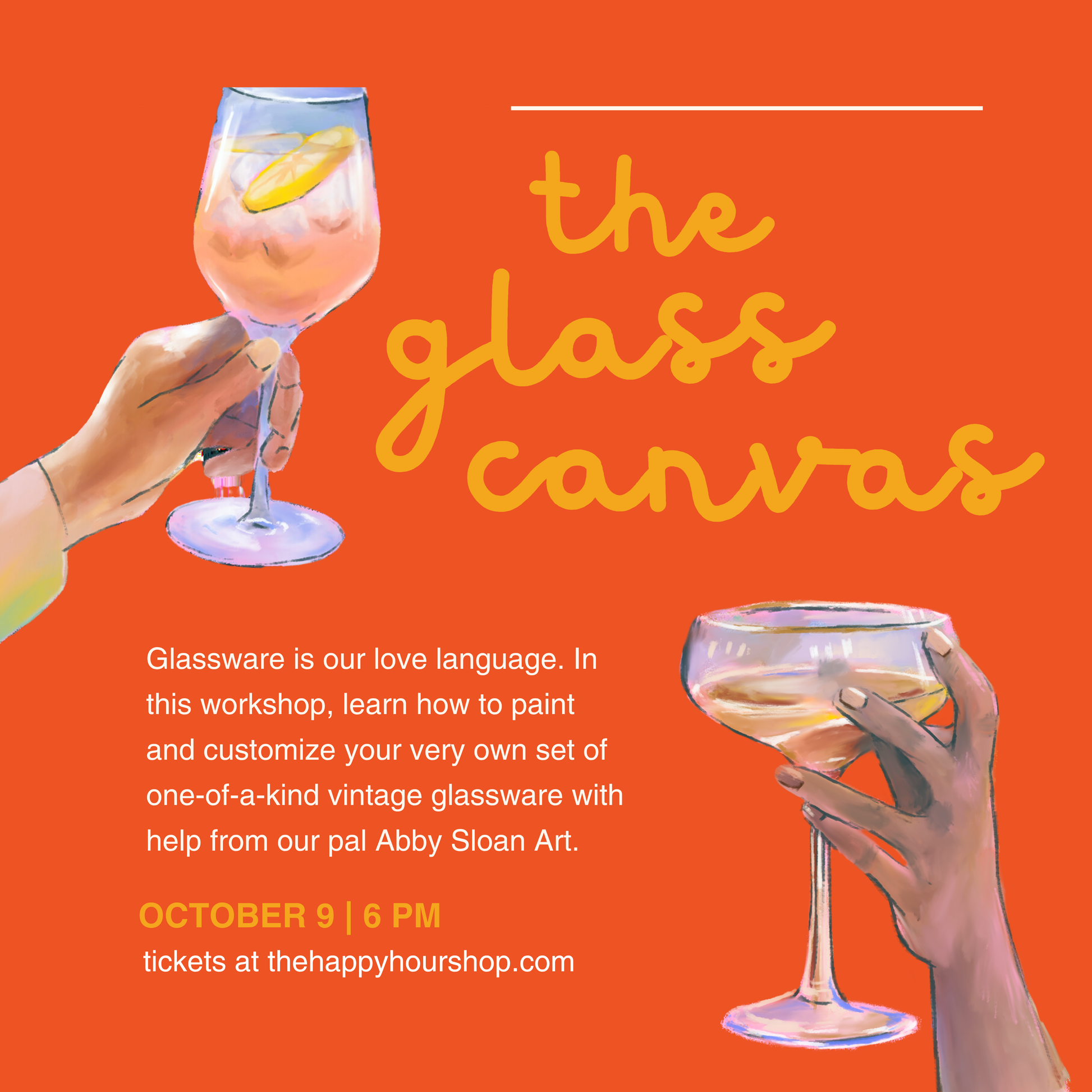 Join us at The Happy Hour Shop to create a one-of-a-kind set of painted vintage glassware with help from our pal, Abby Sloan Art! Whether you're a seasoned painter or a beginner, Abby will guide you step-by-step through the process of customizing your own glassware to use for years and years to come.